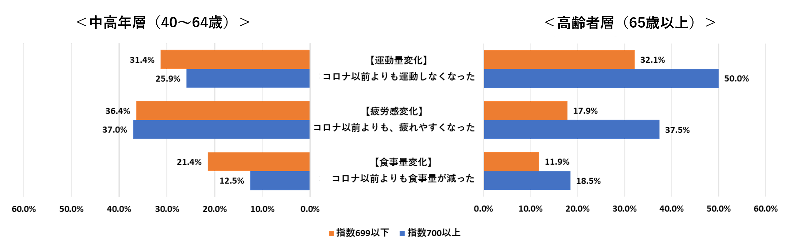 特に新型コロナウイルスの流行により、外出自粛が続いたことで、フレイルの危険性がさらに増加しています。そこで今回、フレイルの指標にもなっている「食事量」「疲労感」「運動量」について、コロナ禍でどのような変化が生じたのか、また喫煙頻度によってどの程度違いがあるのかを調査しました。調査では、 健康と喫煙の関係を示す指標の一つである「ブリンクマン指数(喫煙指数)※3」を基に、一般的にCOPDや咽頭がん、肺がんのリスクが数十倍高くなるとされる指数700以上と、699以下に分けて比較しました。