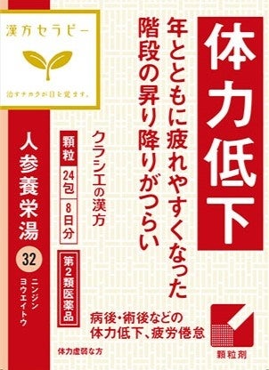 効能:体力虚弱なものの次の諸症:病後・術後などの体力低下、疲労倦怠、食欲不振、ねあせ、手足の冷え、貧血