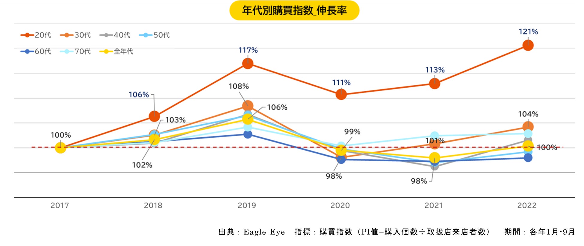 一般用漢方薬市場では、20代の若年層からの需要増加が現れています。購入個数と来店者数を基に算出した購買指数(PI値)の変遷を示した下記のグラフでは、過去5年間で、20代の購買指数が突出して伸長していることが分かります。既存ユーザーの高齢者層だけでなく、漢方薬の需要は幅広い年代に広がっている様子が窺えます。