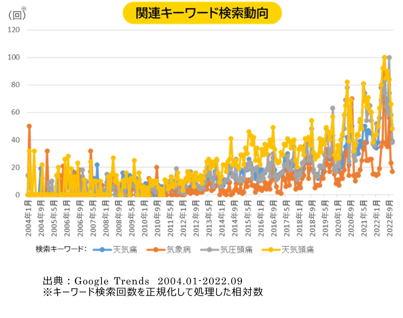 2022年の漢方薬市場において、注目すべきトレンドの一つに「気象病」があげられます。「気象病」は、気候や天気の変化が原因でおこる身体の不調の総称とされており、気候変化の激しい季節の変わり目や梅雨の時期、また台風が多い時期などに特に起こりやすいと言われています。気圧の変化に起因する不調は、2013年頃からじわじわと検索行動に現れていましたが、直近2年で急激に増加しています。「天気によって発現する不調の存在」が認知されたことで、関連する処方である『五苓散(ごれいさん)』や『苓桂朮甘湯』需要も拡大しています。