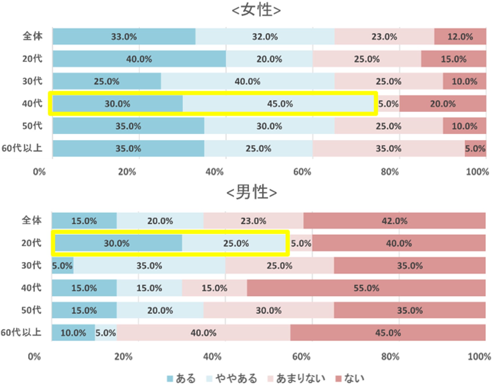 当社が行った調査では、全体の半数が冷え症であると回答しており、中でも女性は全世代で60%以上の方が冷え症を実感していることが分かりました。特に40代女性は75%と世代別で見ても高い結果となり、特に冷え症を実感している様子がうかがえます。