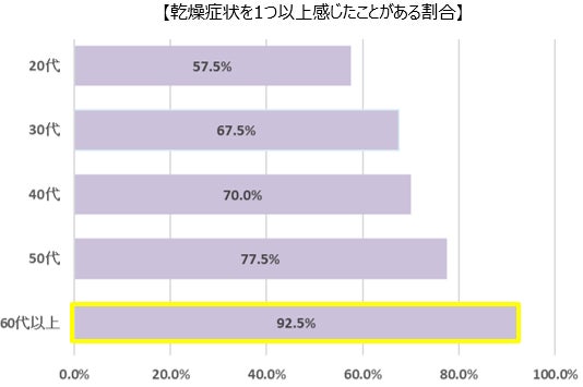 また、乾燥症状を1つ以上感じたことがある割合を年代別で見ると、年齢を重ねるほど乾燥を実感している割合が高くなる結果となりました。60代以上は92.5%にものぼり、中高年層が特に乾燥を感じていることが分かりました。