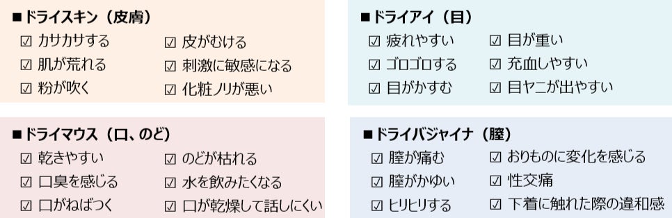 ドライシンドロームとは、ドライマウス、ドライアイ、ドライスキン、ドライバジャイナ(膣の乾燥)などカラダの乾燥のことで、唾液や涙といった乾燥を防ぐ外分泌線の働きが弱くなっている状態を指します。肌、口、目、膣などの乾燥により、粘膜など本来潤っているべき部分まで乾燥すると、皮膜が薄くなるため柔軟性が失われ、粘液の分泌量が減り、乾燥の連鎖が始まります。粘膜の乾燥は抵抗力の低下を招き、風邪や感染症のきっかけにもなるため注意が必要です。