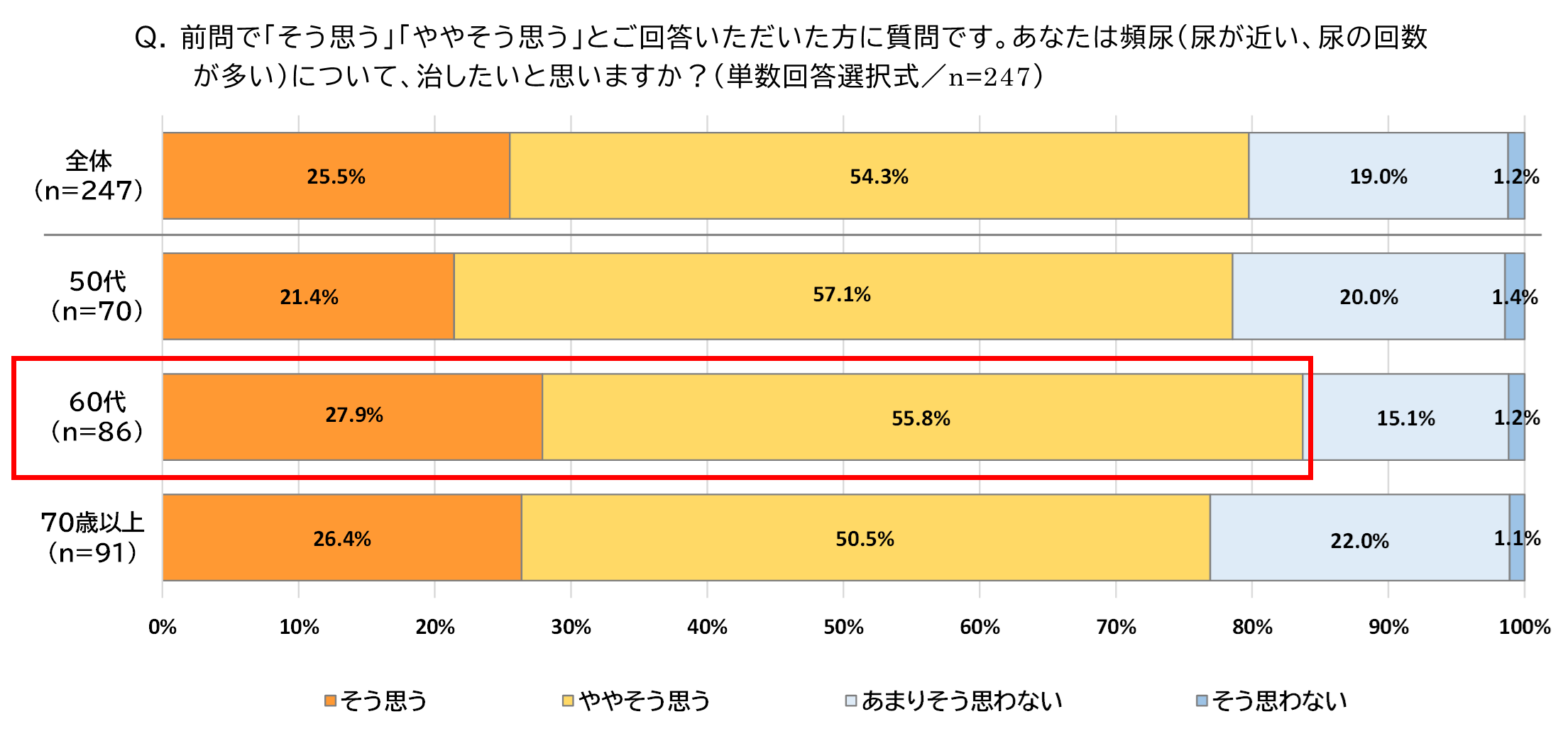 最も高かったのは60代で83.7%にも上りました。前問では、頻尿を自覚している人の割合が60代以降から増加する傾向にありましたが、60代では現役で働いている方も多く、改善意向の高さにつながっていると考えられます。