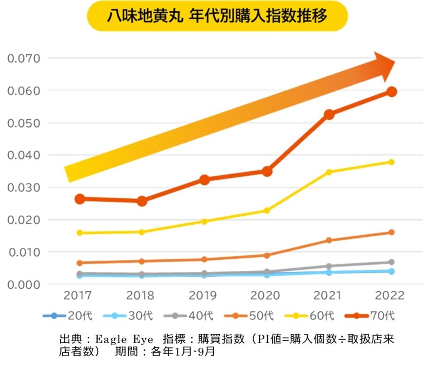 頻尿に対応する処方の一つである『八味地黄丸』は2019年以降、継続して規模を拡大しています。特に60~70代を中心に、購入指数も上昇しており、対象の年代層のボリュームを鑑みると、今後も継続した需要の維持が見込まれる処方です。