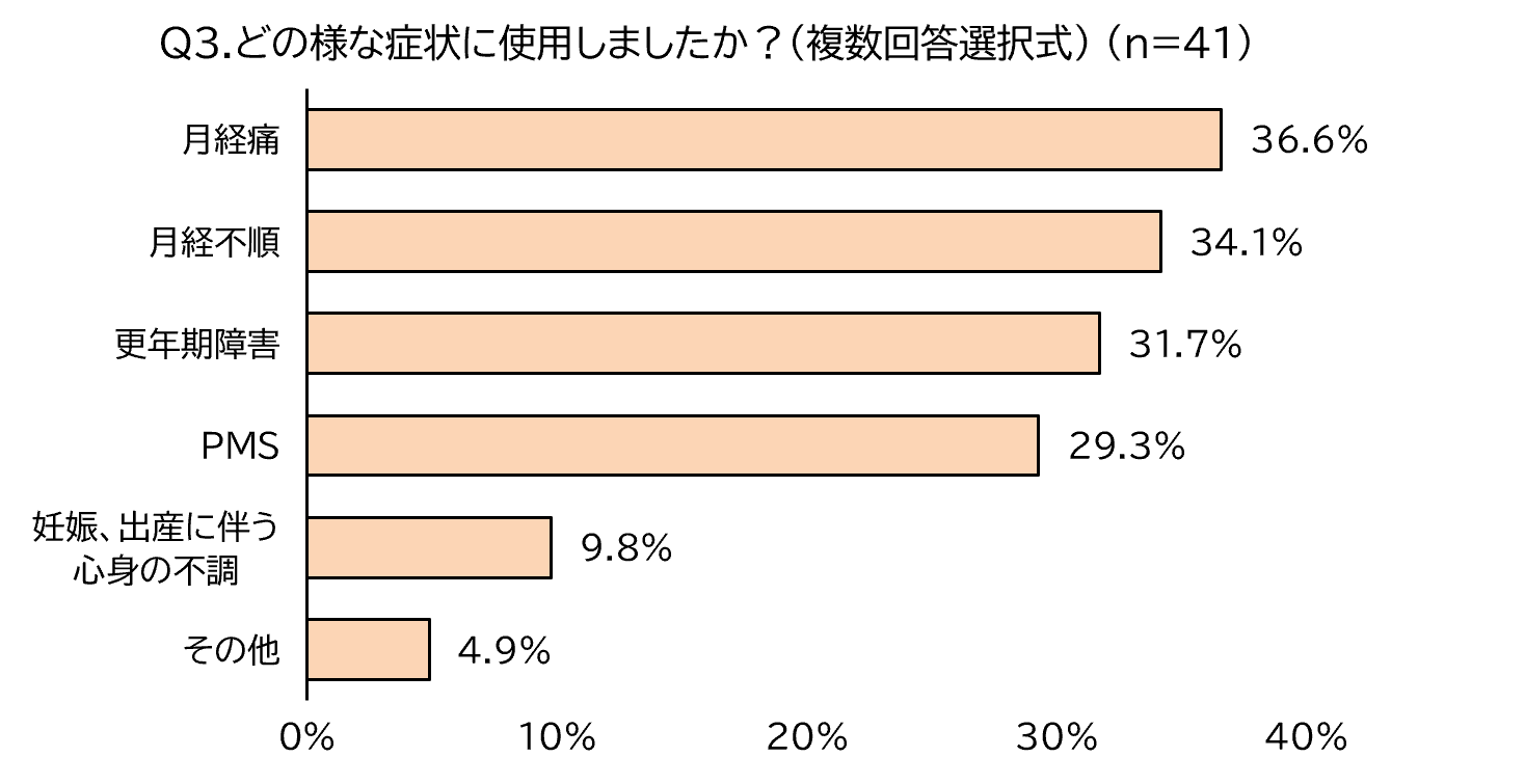 続いて、前述の質問(Q2)で 「はい」と回答した人に漢方薬の服用理由について尋ねたところ、月経痛(36.6%)、月経不順(34.1%)が多く、月経関連が上位に入る結果となりました。続いて、更年期障害(31.7%)も3番目に多い服用理由であったことから、漢方薬が世代によって異なる女性特有の症状に対応していることが分かります。