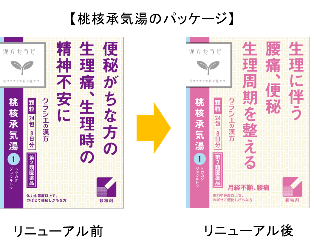 当社が実施したアンケートでは、生理時の不調に関して「腹痛」の次に「腰痛」と回答された方が多いことが分かりました。「桃核承気湯」は体の「気(き)」や「血(けつ)」の流れを整え、生理前や生理中に起こりやすい腰痛などの痛みを緩和する漢方製剤です。女性特有のお悩みに対する漢方薬の活用に注目が集まる中、「桃核承気湯」がより多くのお客様の選択肢となるよう、パッケージ表記を変更いたします。