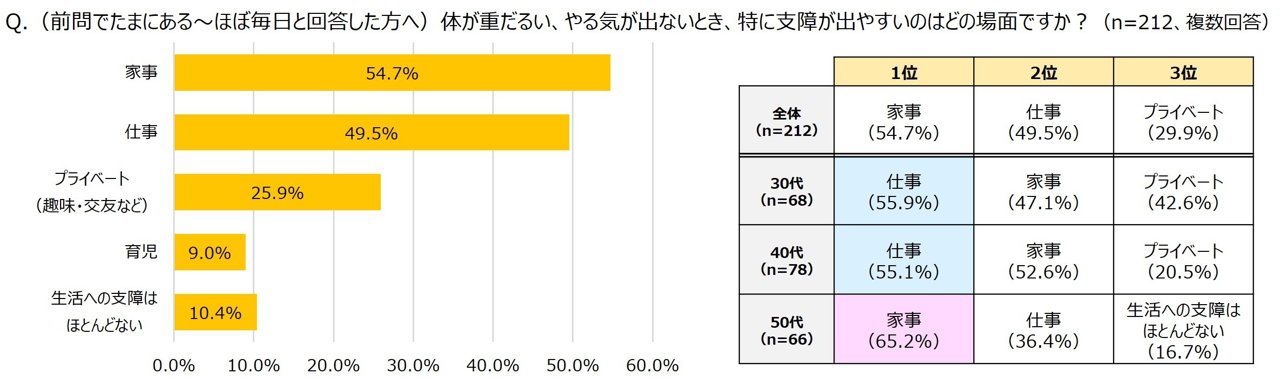 続いて、前問で春先の倦怠感を感じる(たまにある~ほぼ毎日)と答えた人を対象に、特に支障の出やすいシーンを尋ねたところ、全体では「家事」が54.7%で最も多く、次いで「仕事」(49.5%)という結果になりました。この結果を年代別に見ると、50代女性では全体同様に「家事」(65.2%)が最多となった一方で、30代・40代では「仕事」がトップとなりました。