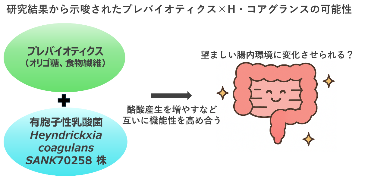 図1. プレバイオティクスとプロバイオティクスであるH・コアグランスの組み合わせ(シンバイオティクス)で可能性が示唆された腸内環境の変化