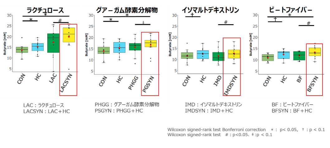 プレバイオティクス単独では、素材ごとに異なる短鎖脂肪酸産生傾向が見られました。研究で用いたプレバイオティクスの中ではLACが酪酸を増加させやすく、PHGG・IMD・BFが酢酸やプロピオン酸、短鎖脂肪酸の総量を増加させやすくなっていました。一方で、HCを併用した場合、各プレバイオティクス単体と比較して、すべてのプレバイオティクスで酪酸濃度が上昇していました。(図2)