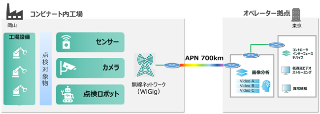 こうした課題の解決を目的として、2026年2月に、IOWN® APNと60GHz帯無線LAN (WiGig注2) を活用した大容量・低遅延通信環境の構築について、岡山県の水島臨海工業地帯 (水島コンビナート) において検証を実施しました。