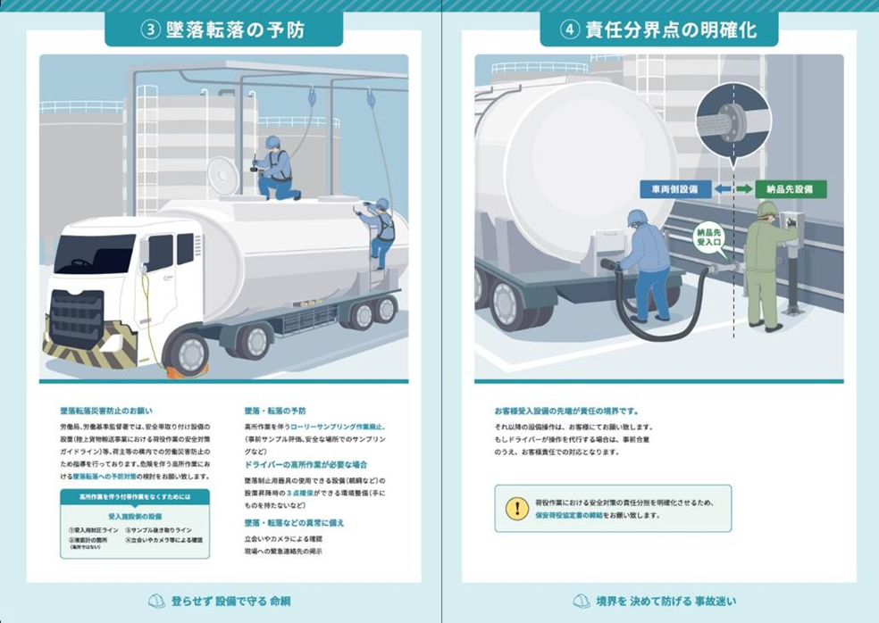 タンクローリードライバーの荷役は、一部において安全とはいえない作業環境下で行われている実態があり、過去から改善要請に取り組んでいるものの、改善が十分に進んでおりません。ドライバーが安全に安心して従事できる作業環境を整備することは荷主の安全配慮義務といえます。また、労働安全衛生法等に基づき、荷役作業時の立ち会い体制の確保、 転落・墜落防止措置、危険物取り扱いに関する安全管理も求められています。これらの安全対策には着荷主の理解と協力が不可欠であることから、荷主と物流事業者で構成する安全・品質(ローリー)分科会(参加:17 企業、リーダー:三菱ガス化学株式会社、サブリーダー:山九株式会社)で議論を進め、関係省庁・業界団とも適宜相談を行い、着荷主の理解促進のため「化学品タンクローリー安全荷役のお願い」のパンフレットを作成しました。