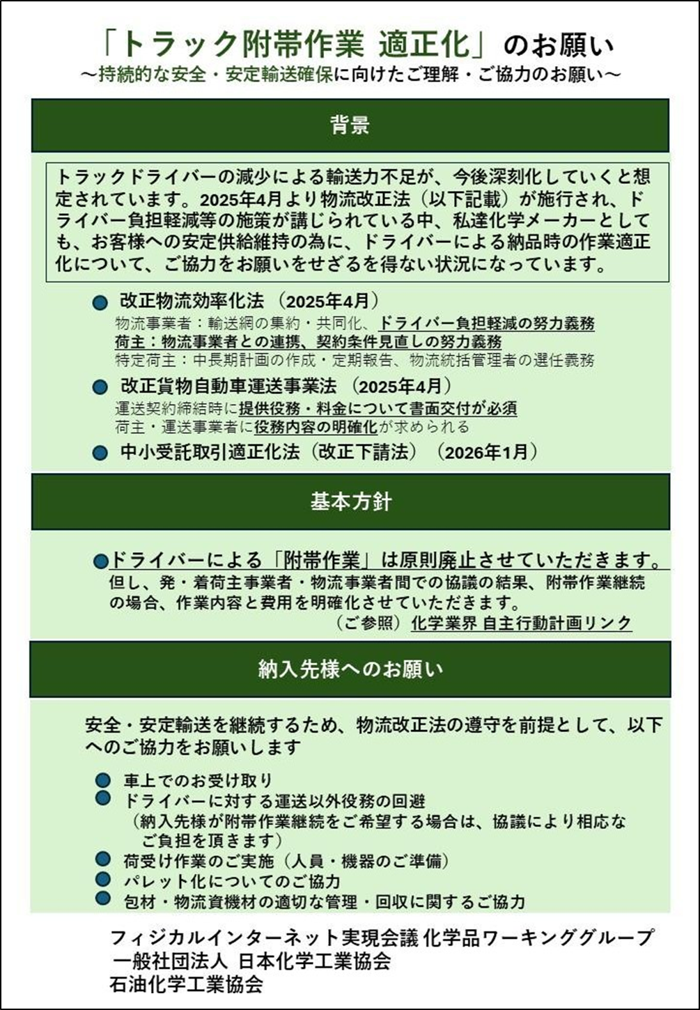 ドライバー不足の深刻化が見込まれるなか、持続的な物流の維持には、荷主・物流事業者が協力して、適正で安全な作業環境を確立することが不可欠です。化学品 WG は以下の取り組みについて、取引先業界および取引先に要請を行い、理解と協力を得てまいります。