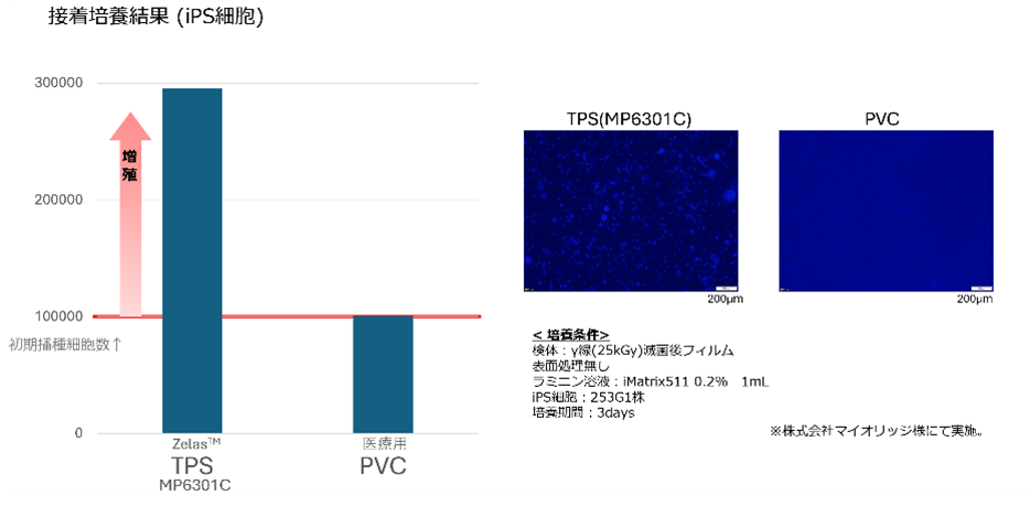 当社は、長年にわたり医療用コンパウンド樹脂Zelas™の高度な配合・コンパウンド技術を蓄積してきました。スチレン系熱可塑性エラストマーであるZelas™ TPSは、優れたゴム弾性を有し、医療機器や医薬品包装用のチューブでの実績を有しています。再生医療分野では、iPS細胞や間葉系幹細胞などの高品質な細胞培養特性が求められますが、Zelas™ TPSはPVC(ポリ塩化ビニル)と比較して優れたiPS細胞増殖性を示します。優れた培養特性に加え、オートクレーブ滅菌およびγ線滅菌(25 kGy)に対応可能な点や熱溶着性など、需要が高まる閉鎖系細胞培養回路※の構築に欠かせない機能性が評価され、今回の採用に至りました。