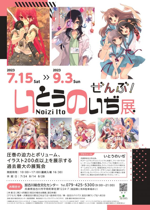 兵庫県加古川市(市長 岡田 康裕)の加古川総合文化センター(兵庫県加古川市平岡町新在家1224-7)では、2023年7月15日(土)~9月3日(日)の期間において、ライトノベル「灼眼のシャナ」や「涼宮ハルヒ」シリーズなどの挿絵を手がけ、ラノベファン、アニメファンに限らず幅広い支持を得ている加古川市出身のイラストレーター、いとうのいぢ先生のイラスト200点以上を一堂に展示する「いとうのいぢ展 ぜんぶ!」が9月3日まで開催されています。