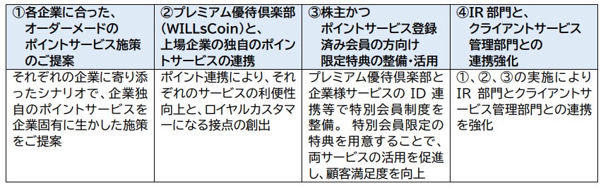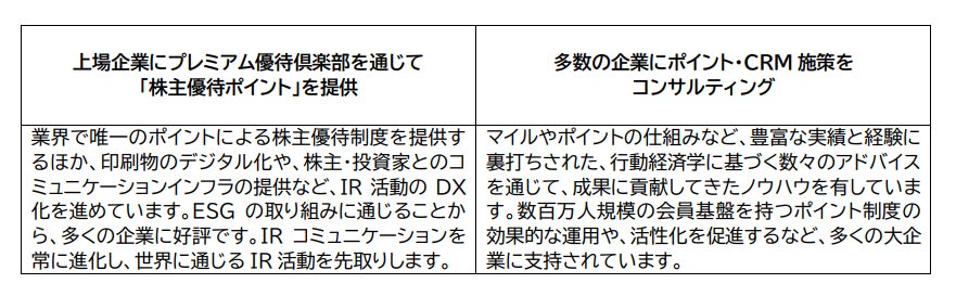 そこで当社は、大企業のポイント制度の効果的な運用や、数百万人規模の会員制度の活性化に豊富な実績を 持つコンサルティング会社と提携し、国内企業の IR 部門に、ポイント制度を通じたCRM施策を提案してまいり ます。株主とファン顧客との統合的なコミュニケーションを通じて、企業の積年の課題に取り組みます。