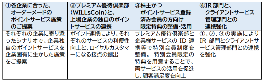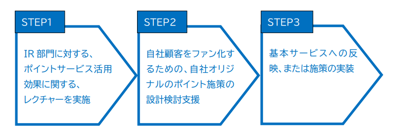 そこで当社は、大企業のポイント制度の効果的な運用や、数百万人規模の会員制度の活性化に豊富な実績を 持つコンサルティング会社と提携し、国内企業の IR 部門に、ポイント制度を通じたCRM施策を提案してまいり ます。株主とファン顧客との統合的なコミュニケーションを通じて、企業の積年の課題に取り組みます。