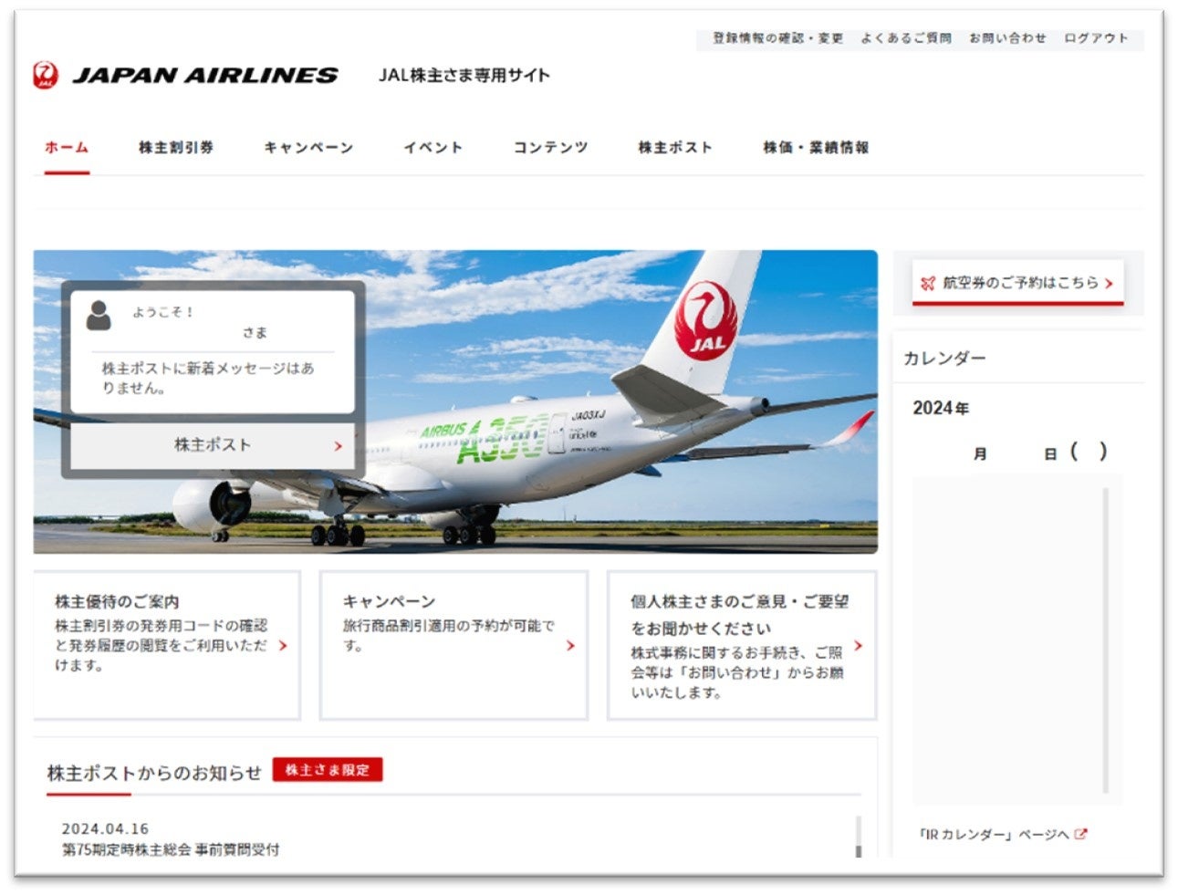 「JAL株主さま専用サイト」画面イメージ