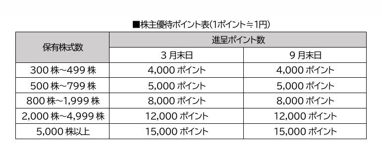 繰越条件:株主優待ポイントは3月末日現在、9月末日現在において株主名簿に同一株主番号で連続2回以上記載され、かつ300株以上継続保有されている場合にのみ繰越することができ、最大4回分まとめて交換することができます。なお、3月末日現在、9月末日現在の権利確定日までに売却やご本人様以外への名義変更及び相続などにより株主番号が変更された場合は、当該ポイントは失効となり繰越できませんので、ご留意ください。