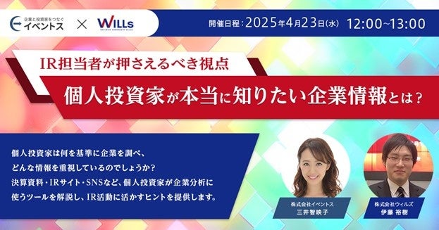 投資家と上場企業を結ぶIR支援カンパニーである株式会社ウィルズ(本社:東京都港区、代表取締役社長:杉本 光生)と株式会社 イベントス(本社:東京都千代田区、代表取締役:上杉 洋平)は2025年4月23日(水)に 『個人投資家が本当に知りたい企業情報とは? IR担当者が押さえるべき視点』 共催ウェビナーを実施いたします。