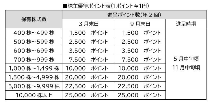 【進呈条件】 2025年9月末日以降、毎年3月末日および9月末日の株主名簿に、4単元(400株)以上保有する株主様を対象といたします。