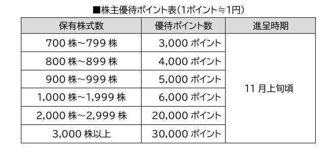 【進呈条件】2025年以降、毎年9月末日現在の株主名簿に記載又は記録された株主様を対象にお手持ちの株数に応じて、株主優待ポイントを進呈いたします。
