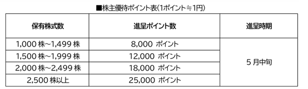 進呈条件:2026年以降、毎年3月末日現在の株主名簿に、10単元(1,000株)以上保有する株主様として記載又は記録されること。