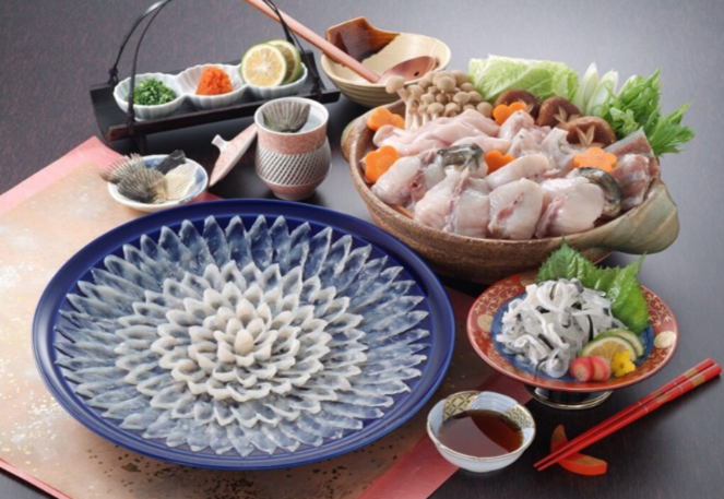 国産の養殖トラフグを刺身とちりのセットにしました。職人が盛付けたお刺身は、見た目も美しく、噛めば噛むほどお口の中に旨味が広がります。ちり鍋も食べやすい大きさに調理しおり絶品です。また、〆の雑炊も絶品です。