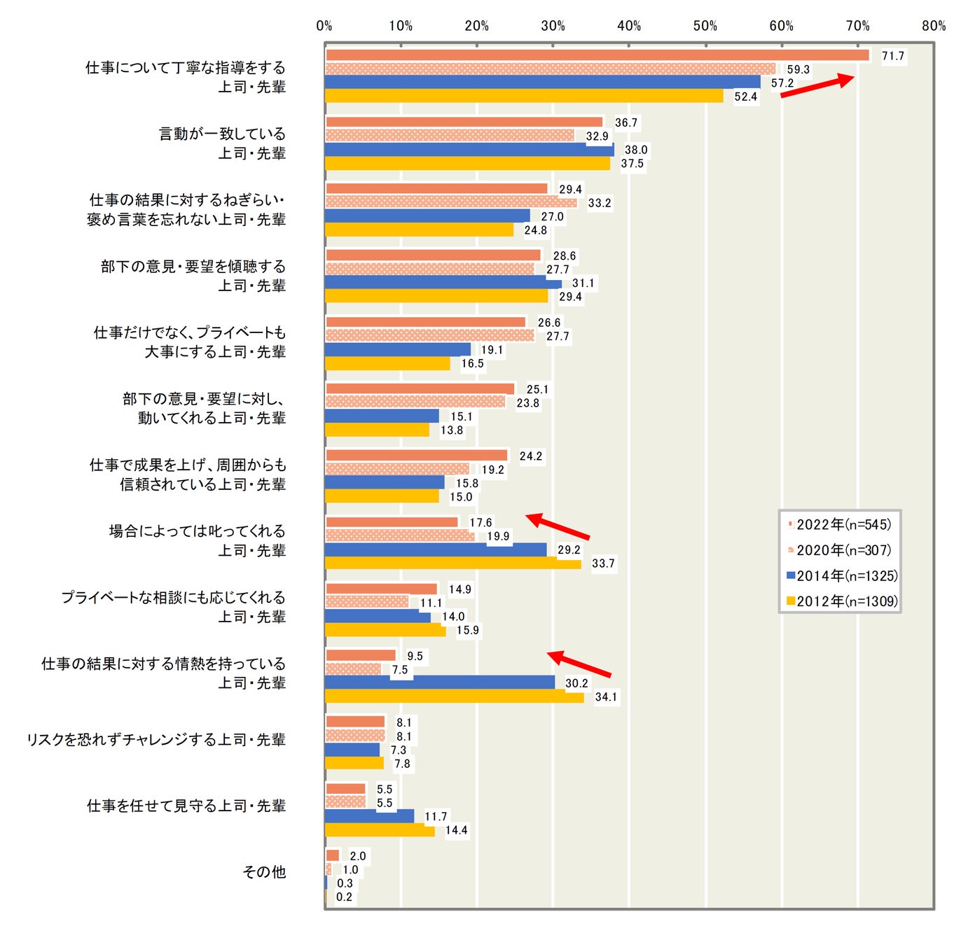 1.理想の上司・先輩は、「仕事について丁寧に指導する人(71.7%)」が1位で2012年以降の調査で過去最高。2012年に数値の高かった「場合によっては叱ってくれる上司・先輩」や「仕事の結果に対する情熱を持っている上司・先輩」は大幅にダウン。