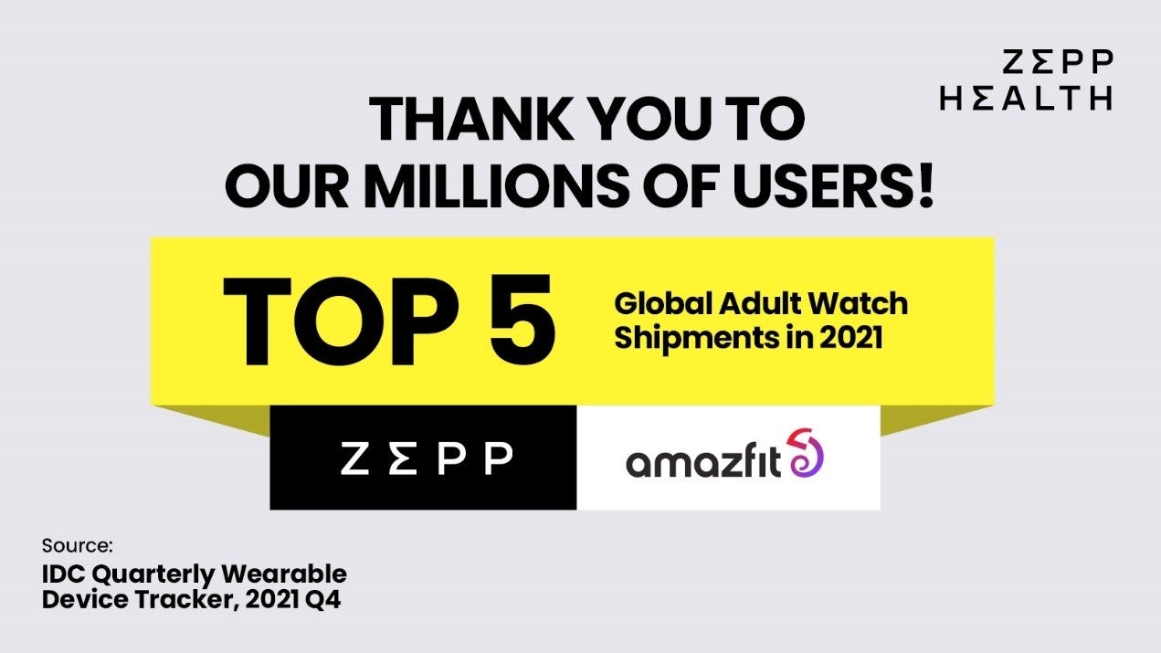 「Amazfit」シリーズを販売するZepp Health Corporationは、2021年の第4四半期に第3四半期に引き続き安定成長し世界の成人向けスマートウォッチ出荷台数でトップ5入りを達成しました。