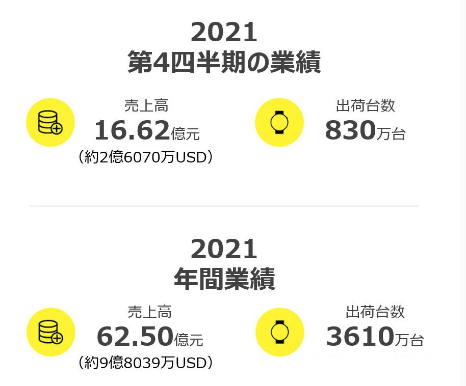 2021年3月17日に発表した2021年度の第4四半期および通年の決算報告書によると、2021年通年でAmazfitとZeppの合計出荷台数は3610万台で前年比59.6%増、売上高は62.50億元で前年比45.8%増となりました。