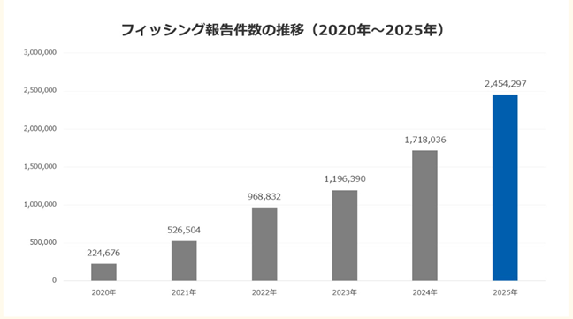 2025年の国内フィッシング報告件数は約245万件に達し、2020年比で10倍以上に増加しました。最近ではAI を悪用した巧妙な手口によって、受信者がフィッシングメールと正規メールを容易に区別することが困難になってきています。特に金融機関を狙った「リアルタイムフィッシング」により、多要素認証(MFA)を突破される被害が深刻化しており、ネットバンキングの不正送金被害額は約80.1億円と過去最高を記録しています。