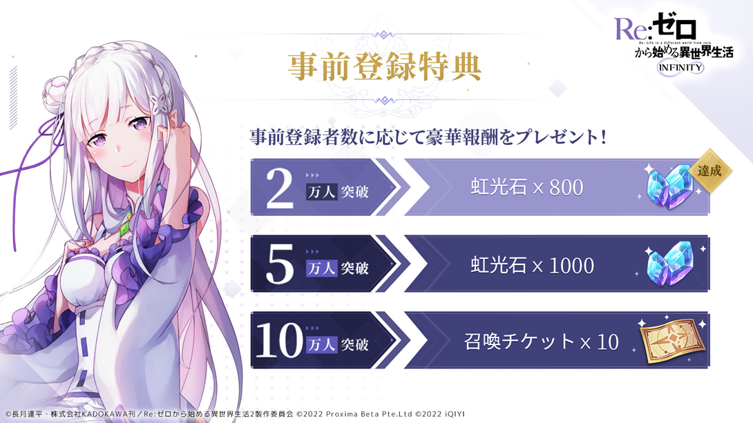 「リゼロ」の新作スマホゲーム 『Re:ゼロから始める異世界生活 INFINITY』 事前登録者数2万人突破を記念して、虹光石800個をプレゼント!