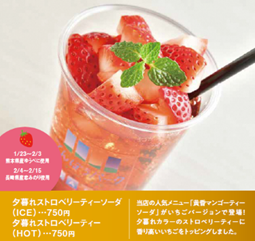 【実施内容】いちご主産県の取り組み。うち1月23日(金)~2月3日(火)の期間中「ゆうべに」を使用したティーソーダ(ICE)・ティー(HOT)を販売