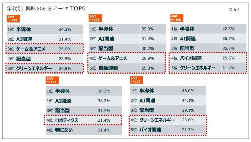 また年代別に見てみると、全ての年代で「半導体」と「AI 関連」が上位 2 つとなりました。一方、「ゲーム&アニメ」が 20 代で 3 位、30 代で 4 位に入るなど、3 位以降に年代ごとで違いが見受けられました。(図 6-1)