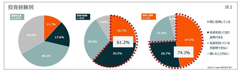 一方、現在の国内の投資初心者におけるETFの認知度や理解度、実際の投資経験については十分な情報が得られていません。このような状況を受け、Global X Japan 株式会社は投資経験者を対象にETFに関する調査を実施し、投資経験の度合いとの比較を行うことといたしました。