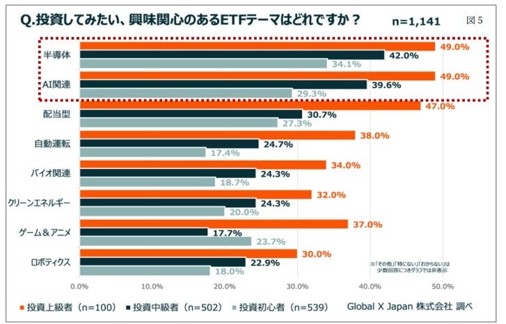 前問でETFの認知・理解を示した方(「既に活用している」「名前を知っており説明できる」を選択)に対して、興味・関心のあるETFのテーマを聞いたところ、初心者〜上級者共に、「半導体」が最も多く、次いで「AI関連」が高くなりました。(図5)※上級者では同率1位
