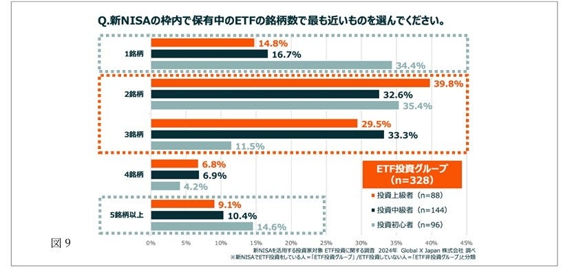 ETF投資グループにおいては、新NISAにて保有中のETF銘柄数は「2銘柄」「3銘柄」と複数銘柄を持っている人の割合が高い結果となりました。