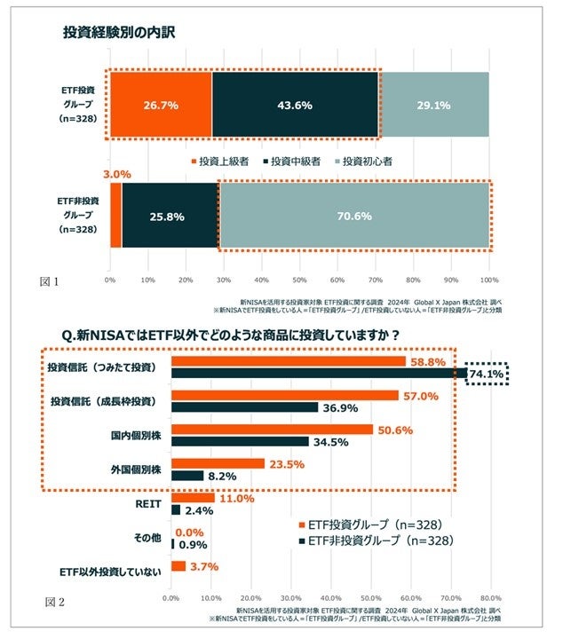 ETF 投資グループと ETF 非投資グループの投資経験の内訳を見ると、ETF 投資グループが投資中級・上級者で約7割を占める一方、ETF非投資グループは投資初心者が約7割を占める結果となりました。(図1)