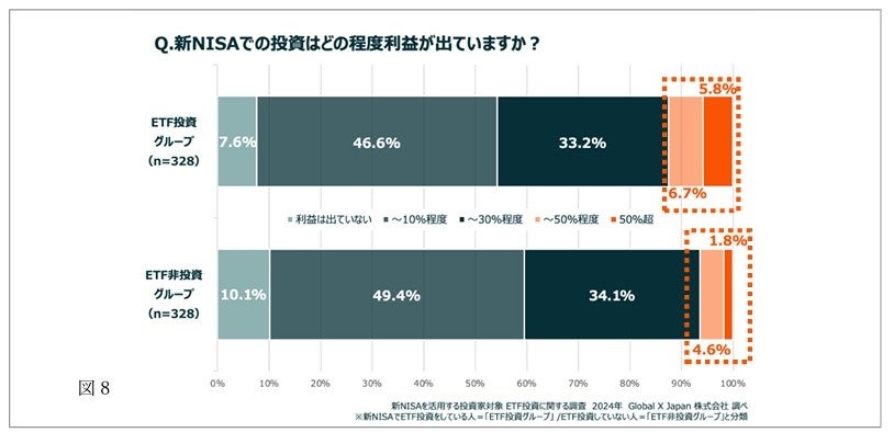 また、「〜50%程度」「50%超」の利益が出ていると回答した人については、ETF投資グループの方が6.1ポイント上回っており、「短期〜中期の値上がり」重視の傾向のある、ETF投資グループだからこその結果も見られました。(図8)