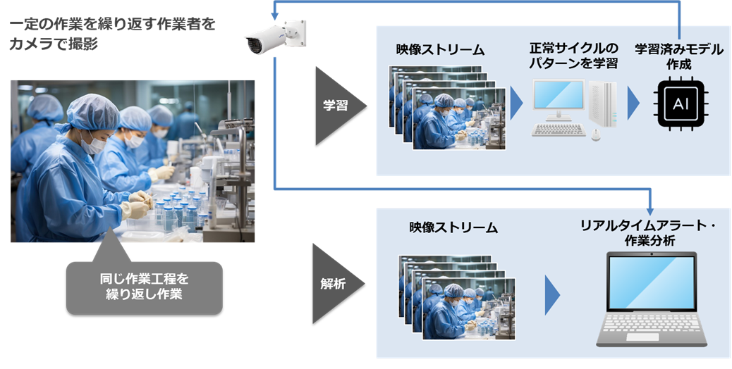 i-PRO製のAIネットワークカメラで撮影した動画を使用し、正常時の作業動作や作業工程の分割タイミングについて、PC上でAIモデルを学習します。学習したモデルをi-PRO製のAIネットワークカメラにアップロードし、作業者の動作を解析することで異常行動をリアルタイムで検知します。