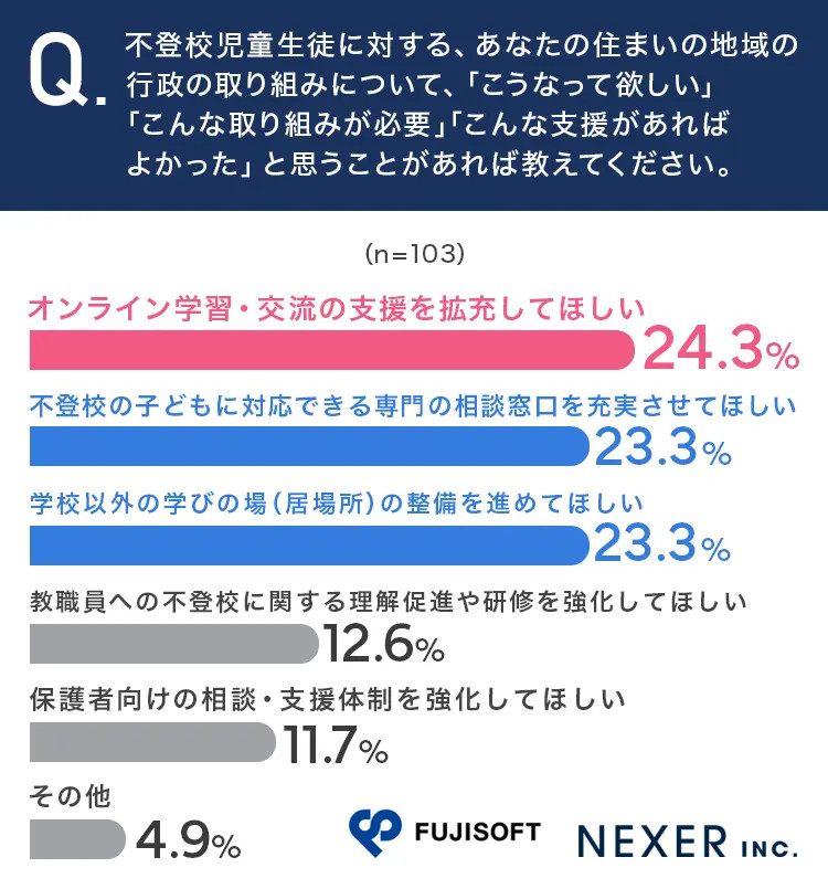 また、不登校児童生徒に対する行政の取り組みについては、約7割の保護者が「充実していない」と回答。特に「オンライン学習・交流の支援拡充」「専門相談窓口の充実」「学校以外の学びの場整備」を求めているという実態が明らかになりました。