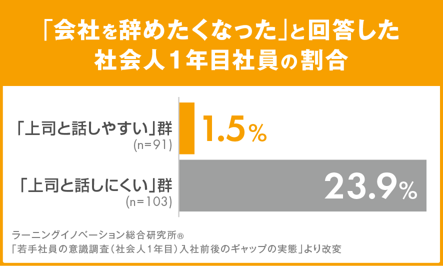 当社が2023年に実施した若手社員調査*では、上司とのコミュニケーションに苦労した社会人1年目社員は、離職を考える傾向が強いことが分かっており、新入社員が社会人として成長するためには、上司との良質なコミュニケーションが欠かせません。