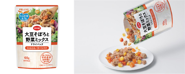 日本生協連は、下ごしらえが不要で使いやすいドライパックシリーズから、「CO・OP 大豆そぼろと野菜ミックスドライパック(にんじん・コーン入り)」を発売。