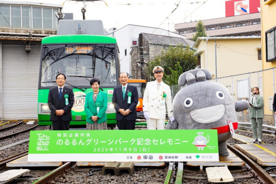 東急株式会社と東急電鉄株式会社は2025年11月9日(日)世田谷線開通100周年を記念し、東京都が推進する「東京グリーンビズ」と連携した特別企画列車「のるるんグリーンパーク」を一日限定で運行。上町車庫で記念セレモニーが行われ、東京都知事 小池百合子氏 や東急グループ代表 野本弘文氏らが出席しました。